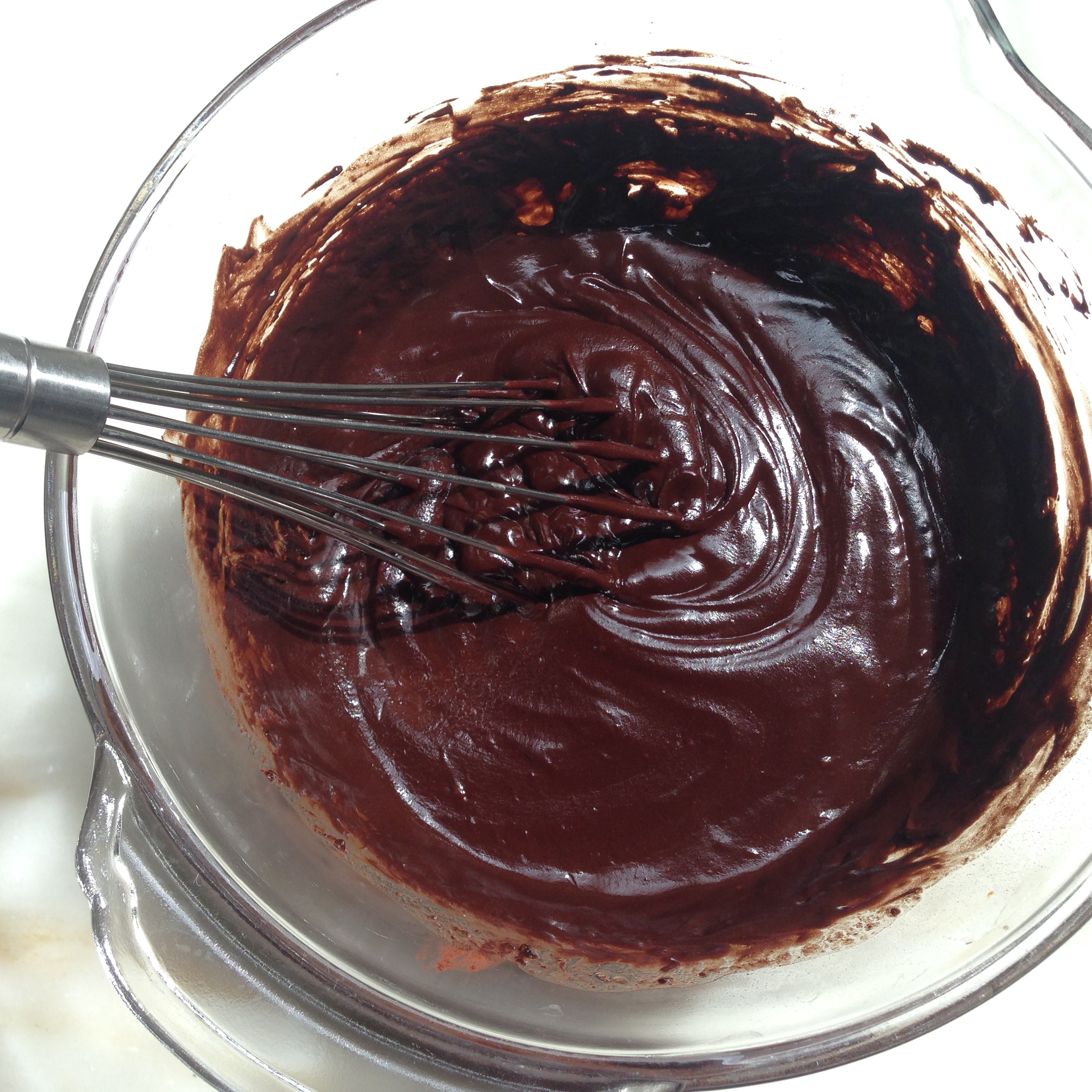 - Keeping the mixer on low speed, slowly add the sour cream mixture to the dry mixture in the bowl. Once added, stop the mixer and scrape down the bowl with a rubber spatula. Now slowly add the chocolate mixture. Once added, stop the mixer and scrape the bowl with a rubber spatula again, making sure to scrape up from the bottom of the bowl to ensure the chocolate is thoroughly integrated with the rest of the batter. mix on low speed for an additional 15 seconds and remove the bowl from the mixer. Mix once by hand with a rubber spatula to ensure complete incorporation.
