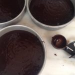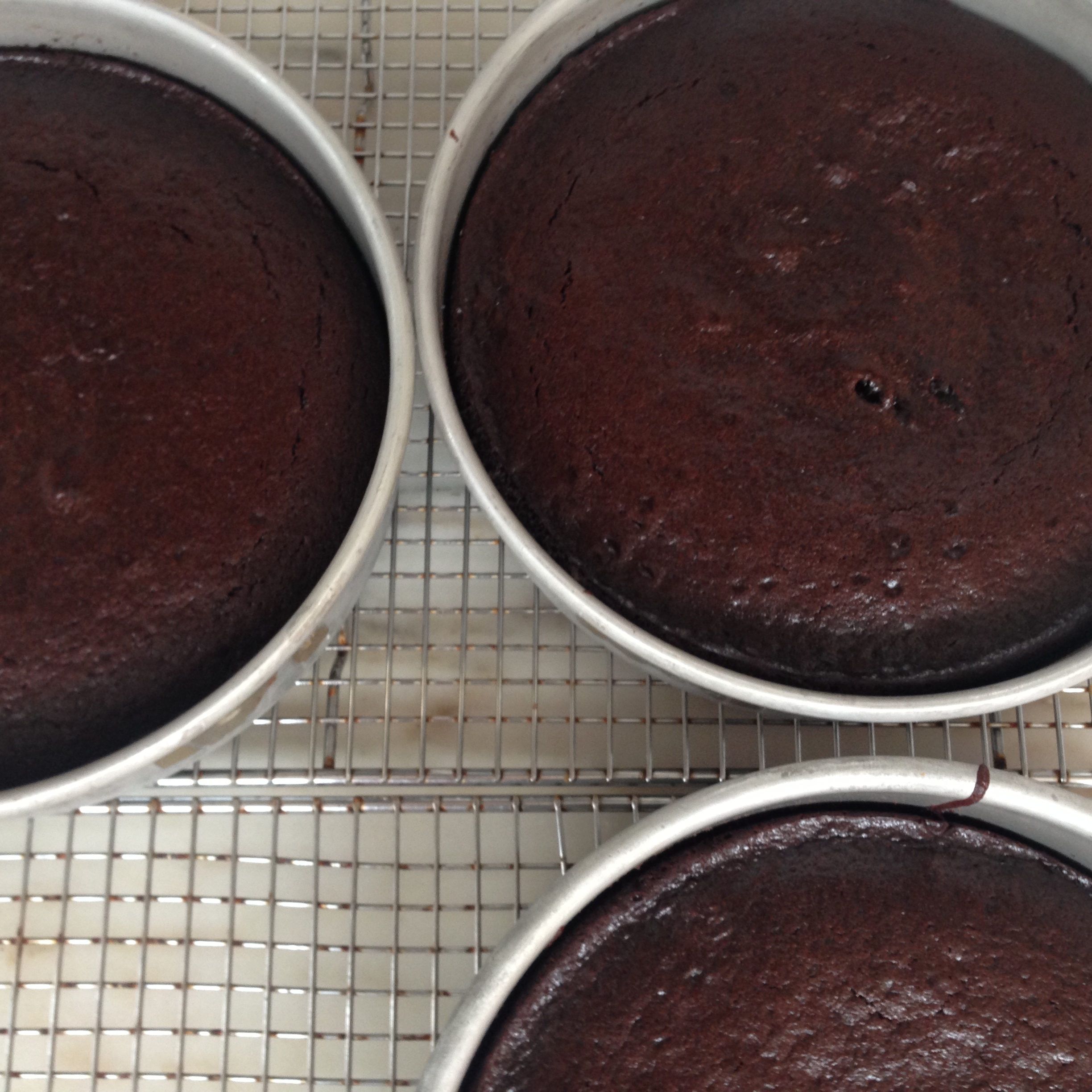 And so, my go-to chocolate birthday cake for the longest while was Martha Stewart’s one bowl chocolate cake. no surprise here, as the cake is super dark, pretty chocolate-y, and totally moist (it’s an oil based cake so the moistness is a given), with an awesome cake-mix-ish crumb (and the fact that it’s “one bowl,” doesn’t hurt either). And then my go-to was the cake recipe on the back of the Hershey’s cocoa tin, another amazingly moist, easy-to-make, chocolate-y cake-mix-ish cake, that very well may be the grandmother of the one bowl cake, as the recipes are practically interchangeable (despite Martha’s calling for buttermilk, and Hershey’s for milk). Eventually, I graduated from one-bowl and Hershey’s to this recipe from Food & Wine, in which melted butter and hot coffee take the place of oil and hot water, two modifications that I loved and filed away for the day I would develop my own chocolate cake.