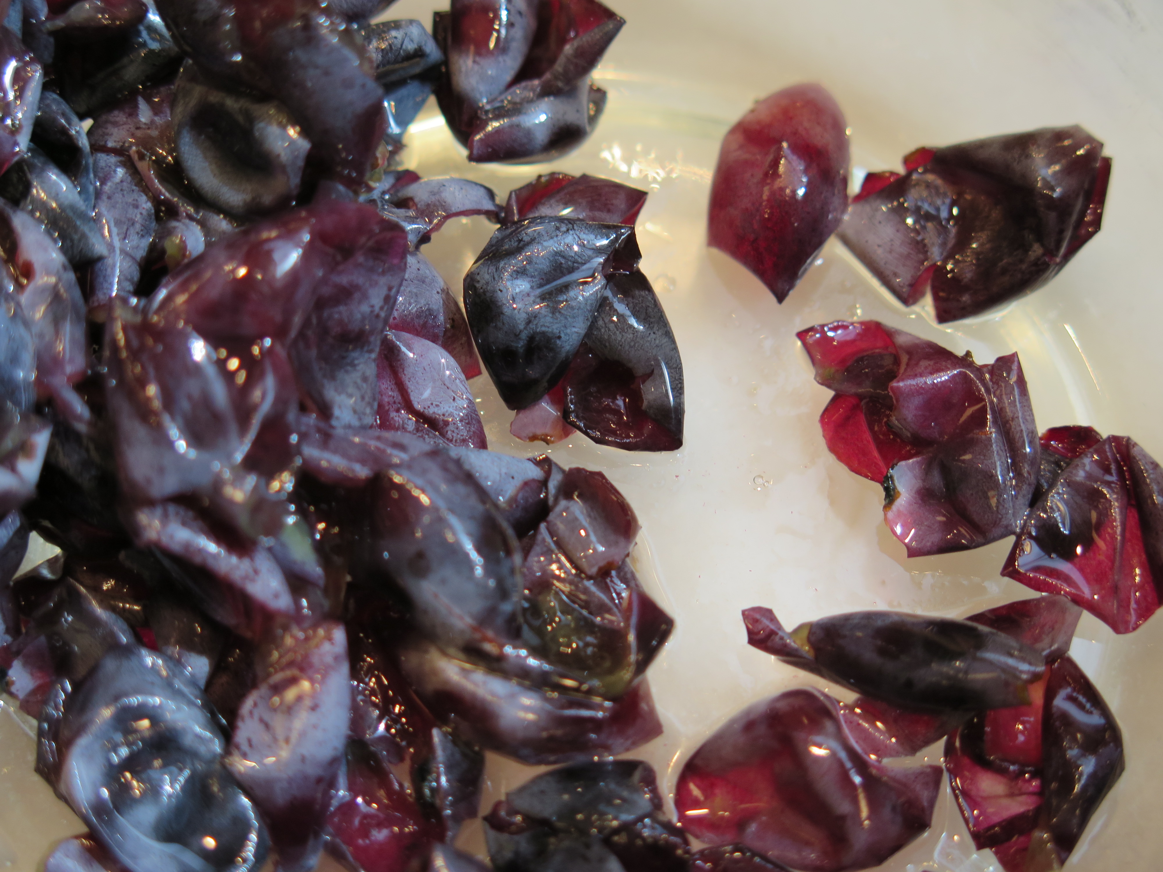 - Remove the skins from the grapes by pinching each grape until the pulp pops out of the skin, but do not try to scrape the skins clean of all the pulp. A little residual pulp is a good thing.
