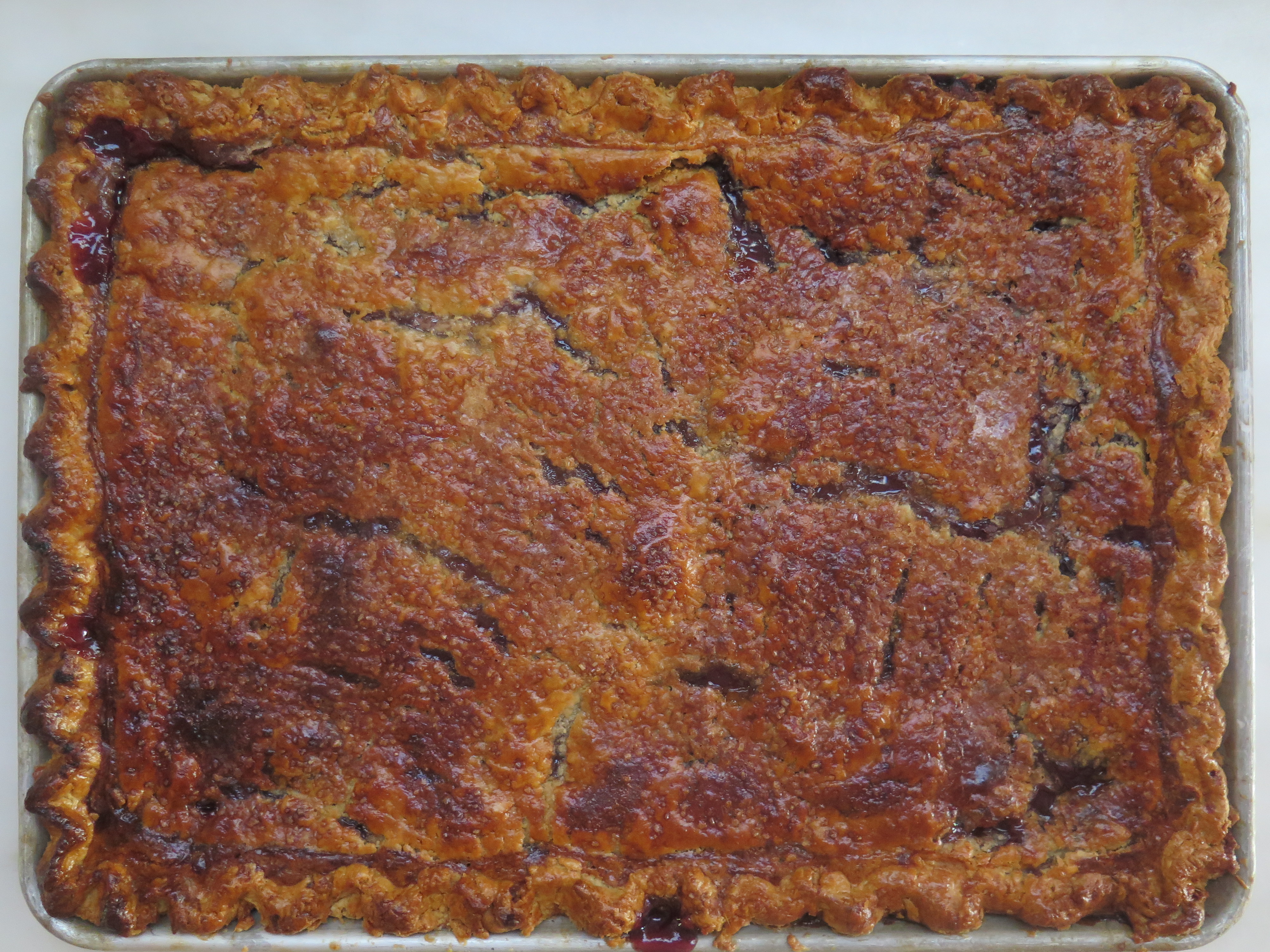 It’s been almost a year since my slab-pie obsession began. (Thanksgiving 2013, to be exact, when 30 people showed up unexpectedly at our house for Thanksgiving — okay, I’m lying, they were invited.) My slab-pie of choice is one baked in a half sheet pan (as opposed to the daintier version described in my strawberry rhubarb pie recipe). But I like them all. I like the crust to filling ratio in slab pies, I adore the presentation, and am partial to desserts that feed a crowd — even the smaller slab pie offers up about four more slices than a traditional pie-dish pie.