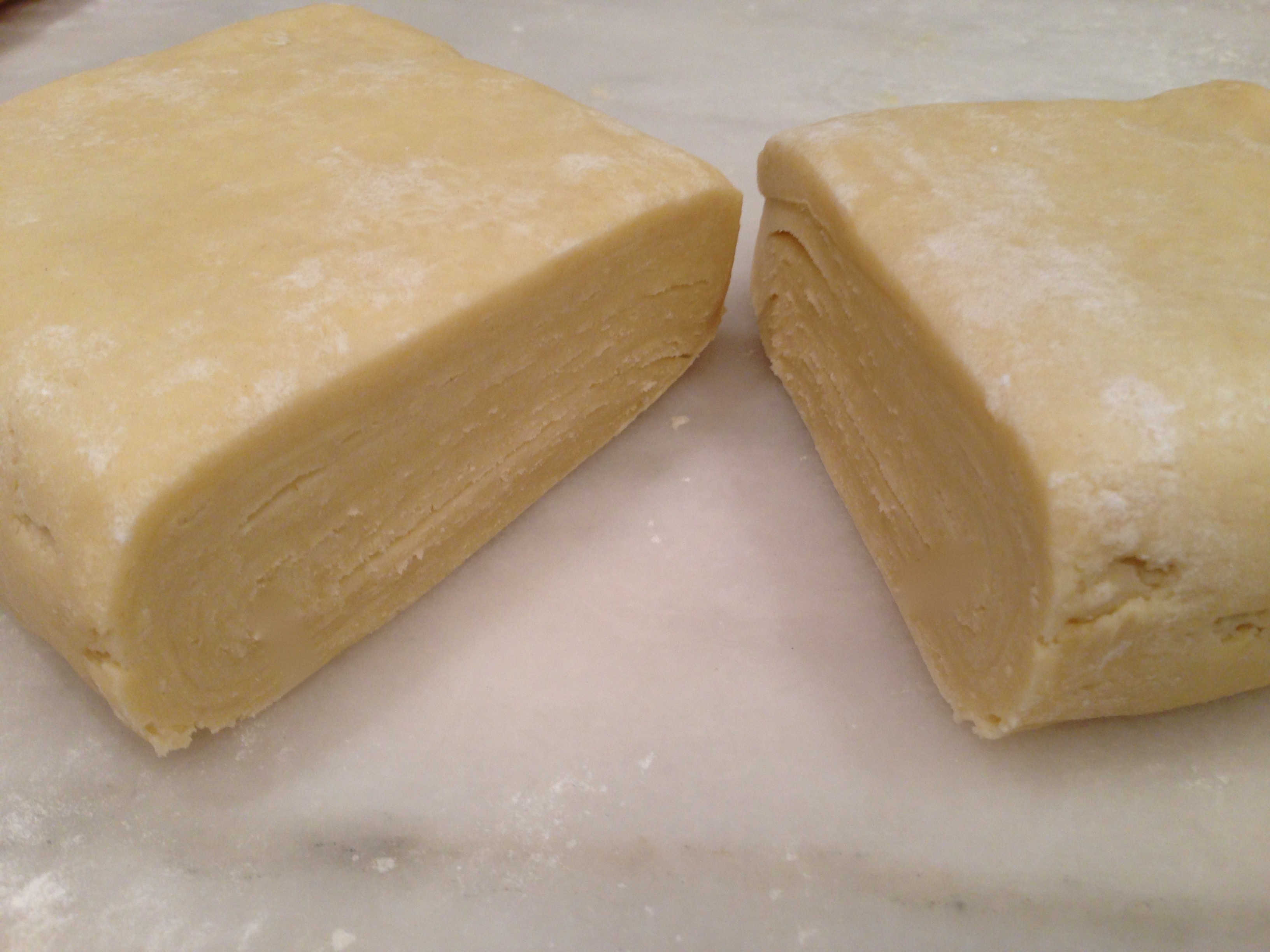 • Once the dough is folded, roll it out again into a rectangle (re-flouring beneath it and on top, if necessary), and fold up the ends, like a letter, for a second time. Repeat this one or two more time (3 to 4 times in total). By the third time, your dough should have transformed into something much more pliable and easier to work with. Cut the final rectangle in half, form each half into a disc (or keep it in its rectangular shape, if making a slab pie), tightly wrap each disc/rectangle in plastic wrap, and place in the refrigerator for 45 minutes.