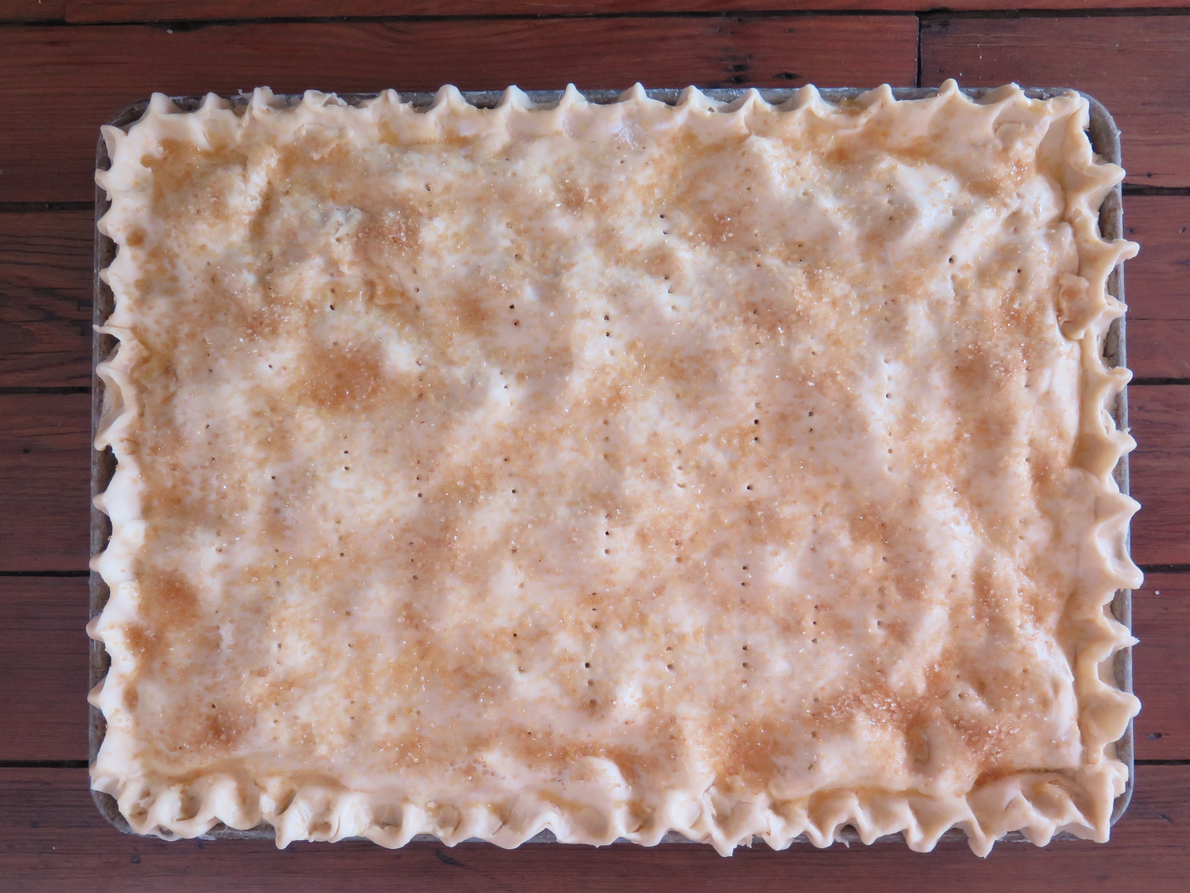 - Place one rolled out sheet of dough in the bottom of your half sheet pan as per the pie crust instructions and add the apple filling. Dot the top of the filling with the butter-y brown sugar crumble, and continue to follow the pie crust instructions for prepping and baking your pre-baked pie.