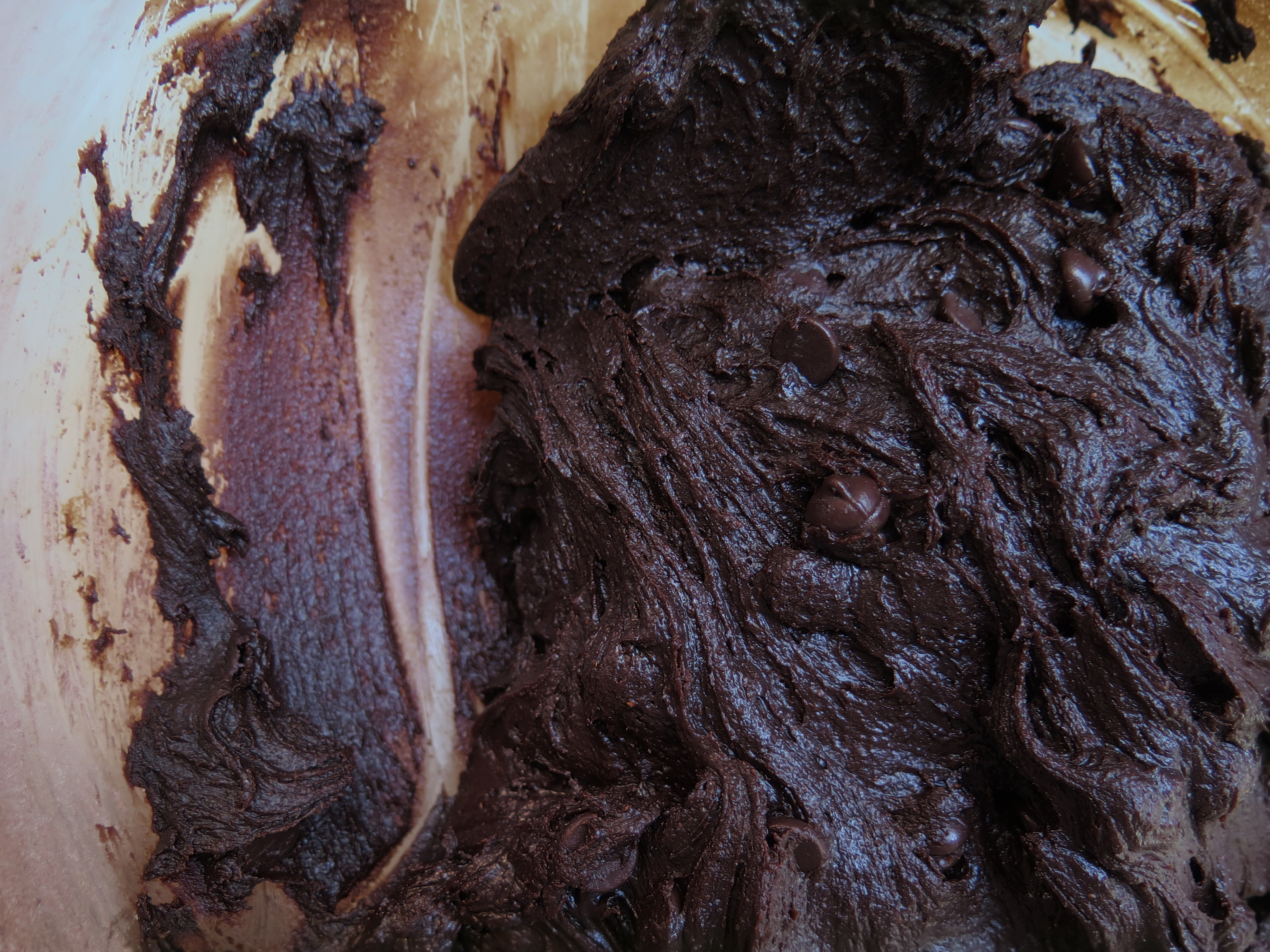- With the mixer on low, add the dry ingredients until the dry is about three-quarters of the way incorporated into the wet. Remove the bowl from the mixer and, using a rubber spatula, incorporate the remaining dry into the wet by hand. Place the stand mixer bowl into the refrigerator and let the dough rest for 30 minutes.