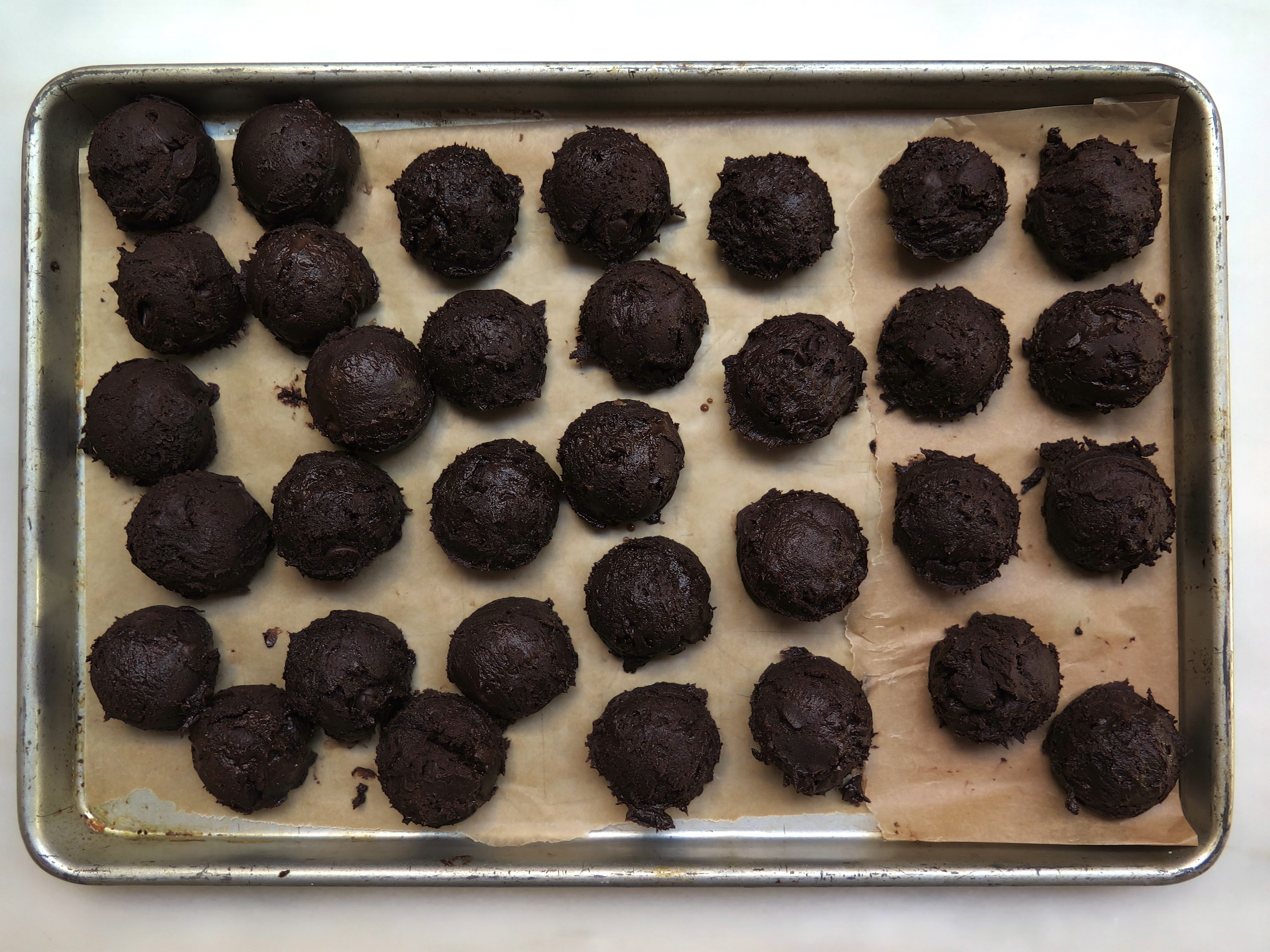- Remove the bowl from the refrigerator, and using a cookie scoop, scoop the cookie dough onto a parchment lined cookie sheet. Place in the refrigerator for 24 to 36 hours.