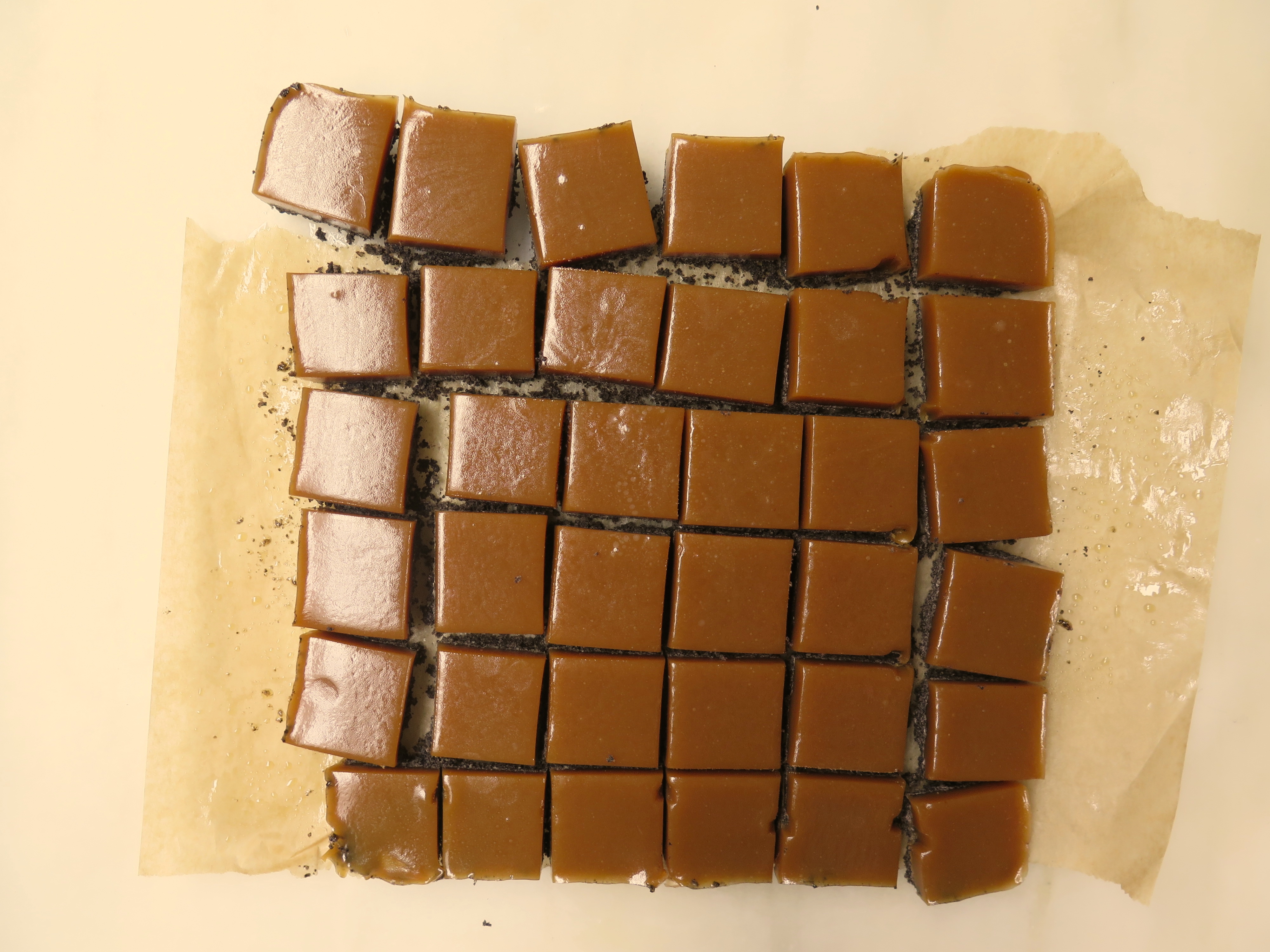 - Place the pan back in the refrigerator until the chocolate has hardened, at least an hour. Remove the chocolate-covered bar from its pan, using the parchment paper to lift it out, and place it on a cutting board. Peel away the parchment paper and using a large chef's knife, cut the caramel into 36 tiny bars (I recommend making six slices on one side and six on the other). Sprinkle with flaky sea salt and let sit for 30 minutes before serving.