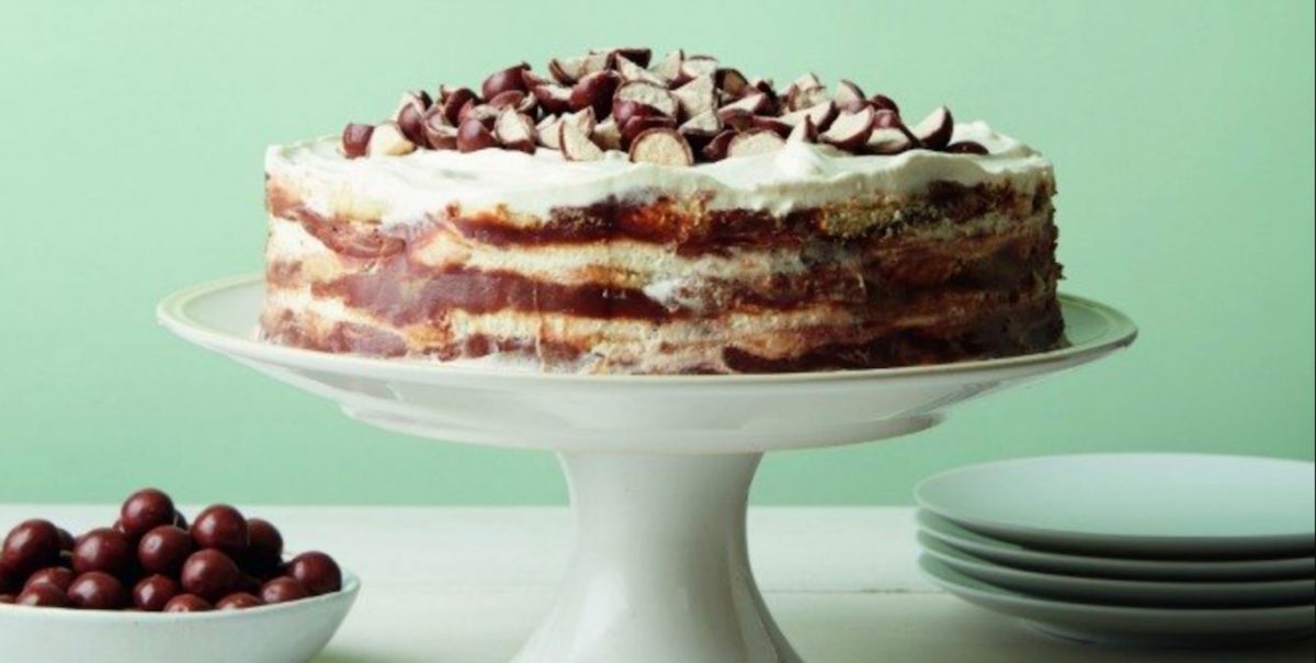 - Peel the plastic wrap from the cake and run a paring knife between the paper and the pan. Open the clamp, remove the pan sides, and gently peel back the parchment paper. Transfer the cake, still on the pan bottom, to a serving platter. Sprinkle crushed malted milk balls on top of the cake. Using a knife, slice into wedges and serve.