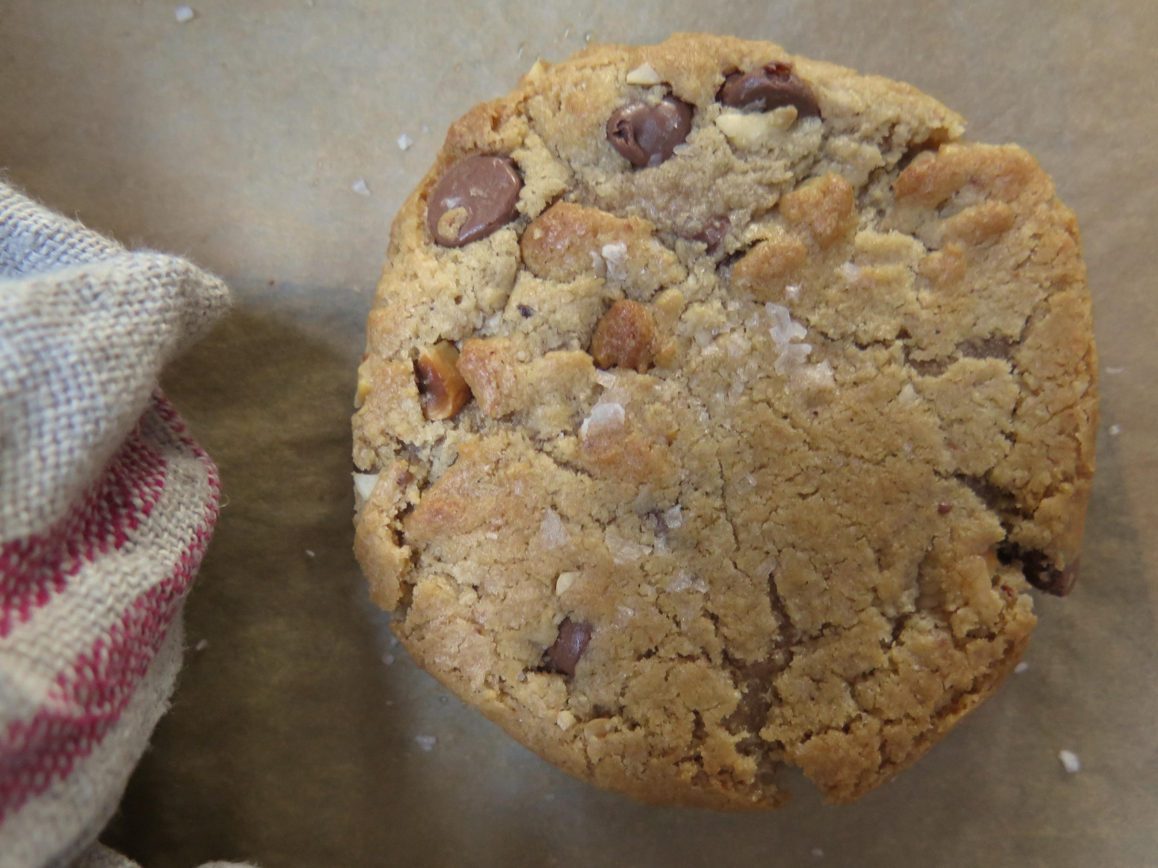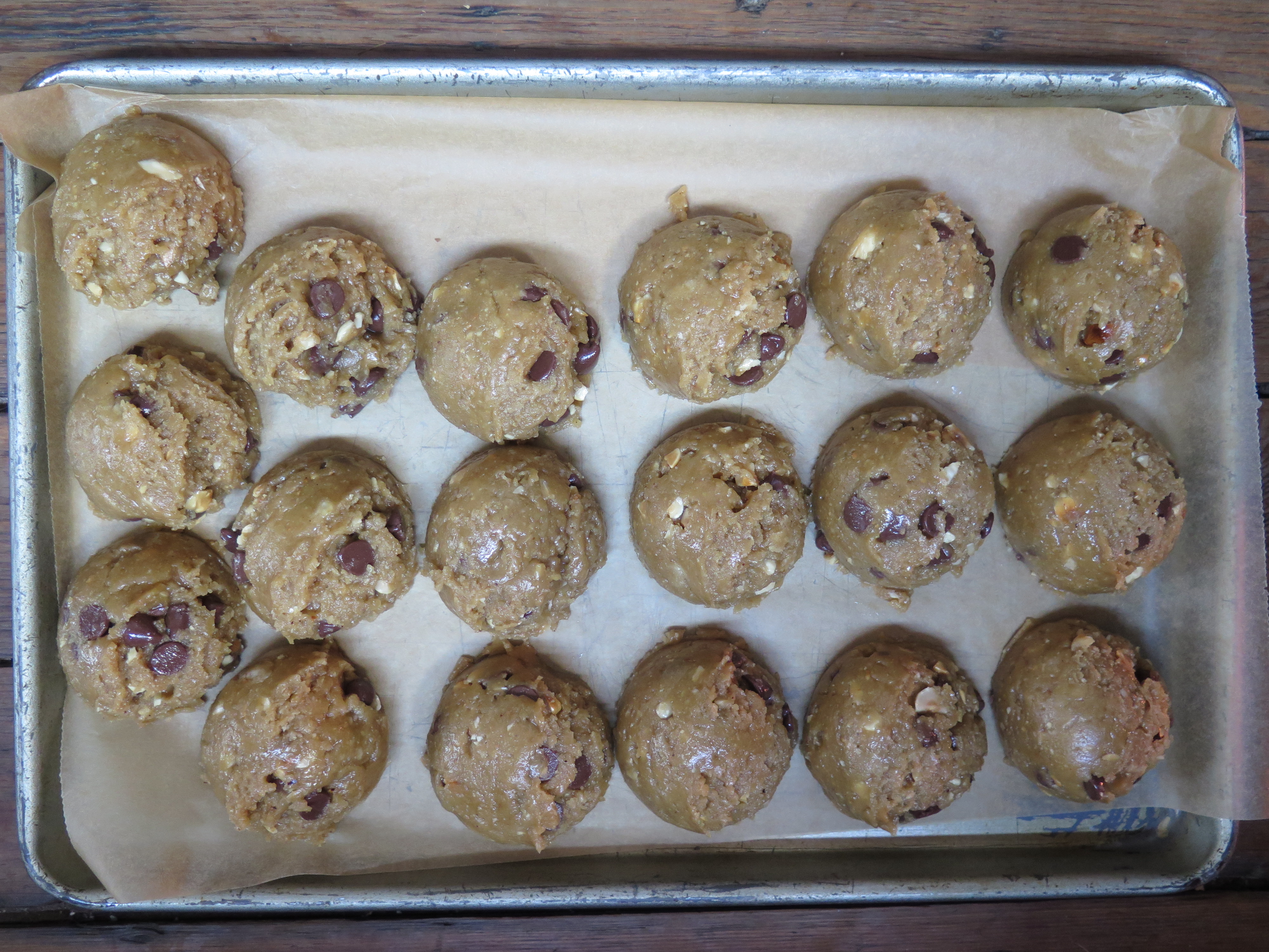 • When ready to bake the cookies, preheat the oven to 375 degrees and transfer as many cookies as you would like to bake to a new parchment-lined pan. Sprinkle with Maldon sea salt and bake the cookies for 12 minutes, rotating after 6, until the cookies are beginning to brown. Let them cool on a rack, but serve while still warm, if possible.