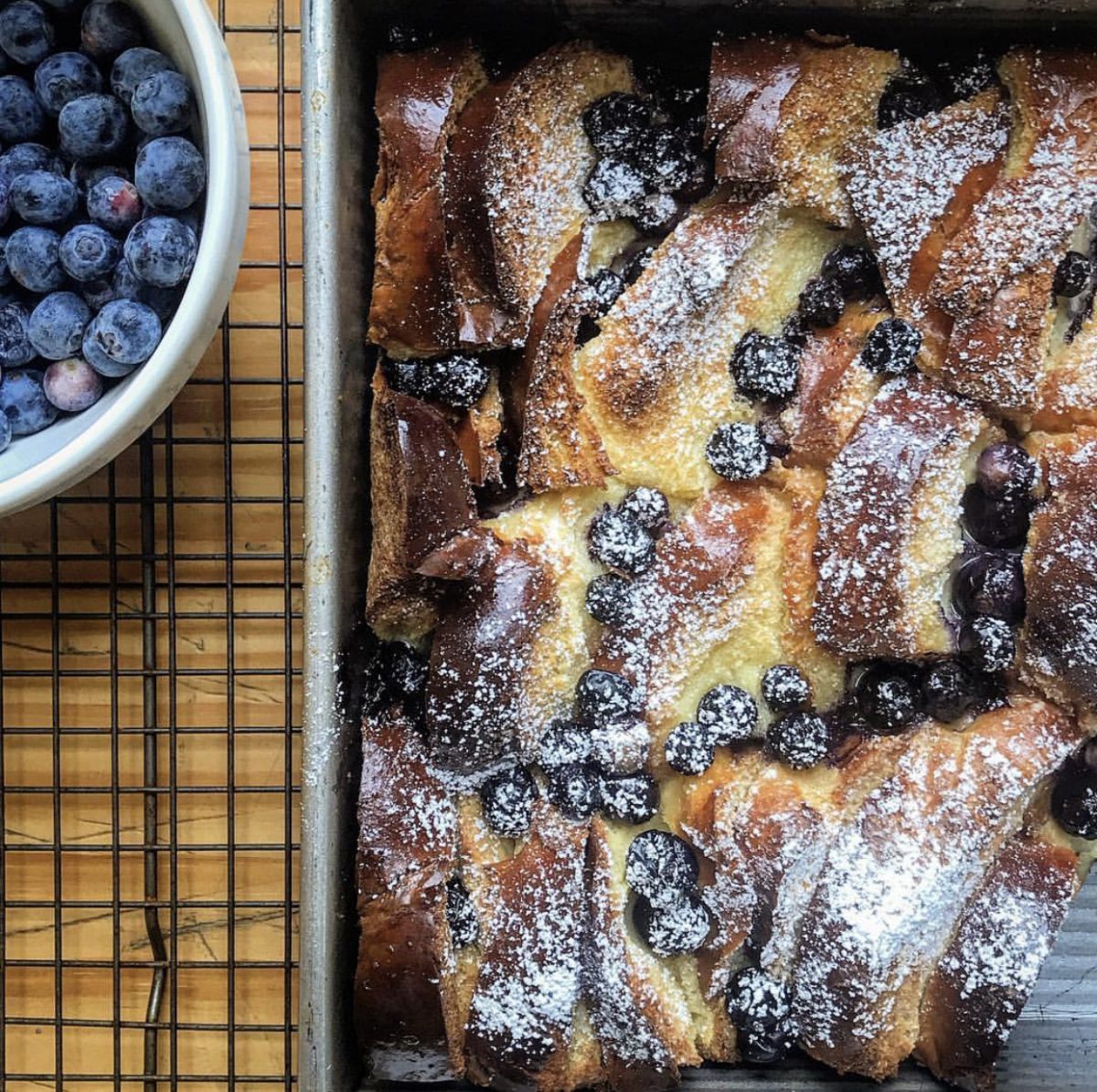 And here’s the thing about baked french toast (in addition to the simplicity of the ingredients), it is one of those dreamy baked goods that you make ahead of time!! (Usually I am wary of exclamation points, but this calls for two). The night before, you slice the bread, layer it (attractively) in your pan, combine all the remaining ingredients, whisk, pour over the bread, and sprinkle on (kind of a lot) of blueberries. Place the pan in the fridge for the night so the bread can soak up the custard, and in the morning, you do nothing but pop it in the oven and feed it to your folks. And to say there’ll be no arguing — even among the teens in your life — is an understatement. Enjoy.