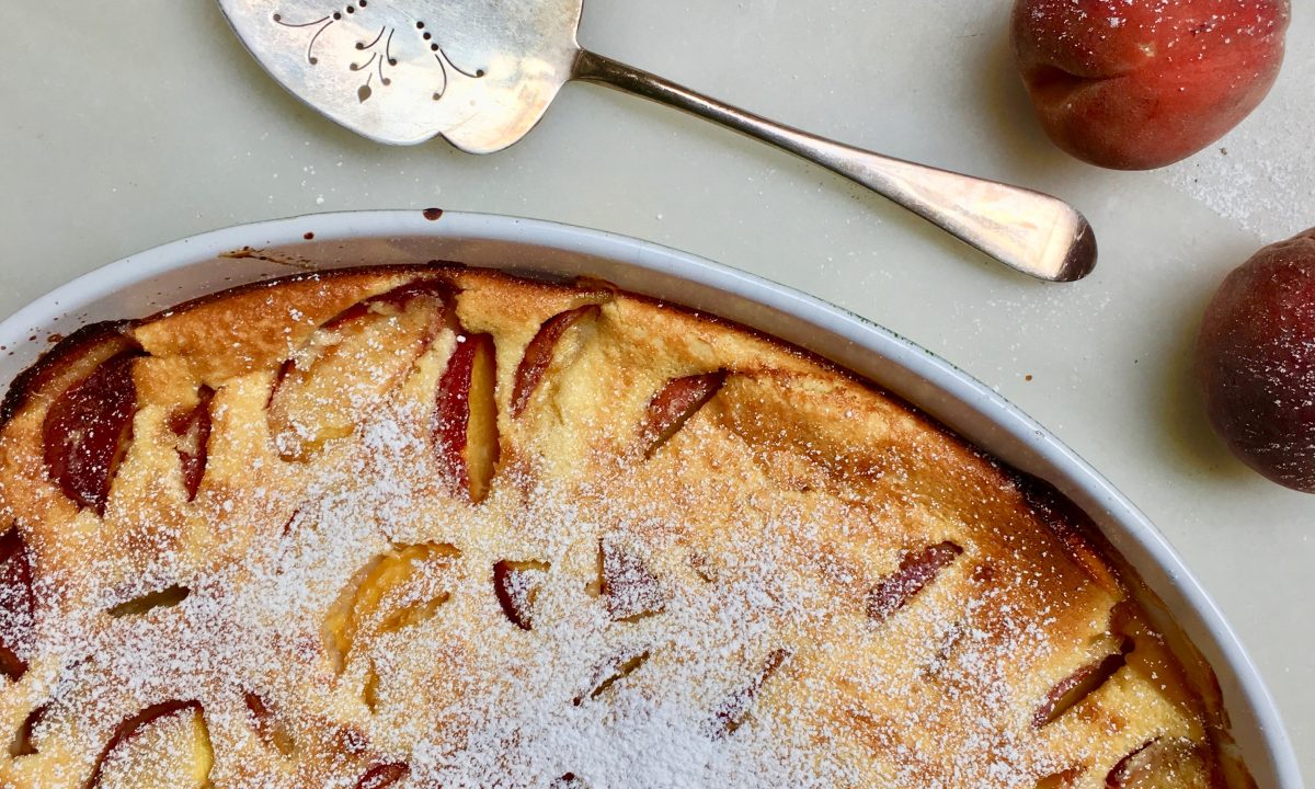 Peach clafoutis could not be easier to make – the most difficult task is cutting the peaches – and I have you leave the skins on, to make even that easy-peasy. The custard is made in the blender and then poured over the lightly sweetened peaches in a shallow baking dish. Thirty-five to forty minutes later, you’ll be in peach heaven.