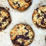 So, these are Sarah Copeland’s chocolate chip cookies – aptly named “A Chocolate Chip Cookie for Modern Times” from her beyond gorgeous new book, Everyday is Saturday, published by Chronicle Books – and in fact, Chronicle was kind enough to share an advanced copy with me, so I have had this treasure for a few months now. (FYI: I like to refer to the cookies as “one-bowl chocolate chip cookies with (some) almond flour,” and you will see why, below). Sarah’s book is all about easy cooking for any day of the week, with recipes and strategies for doing so. I am – if you did not know – SUPER into easy, so this book, with the most beautiful photographs by Gentl and Hyers, and the simplest, and most delicious (delicious sounding – haven’t made EVERYTHING (yet)) recipes, is obvs right up my alley. Of course, I always turn straight to the sweets chapter of any cookbook I peruse, and Sarah’s chapter is all that, and then some.