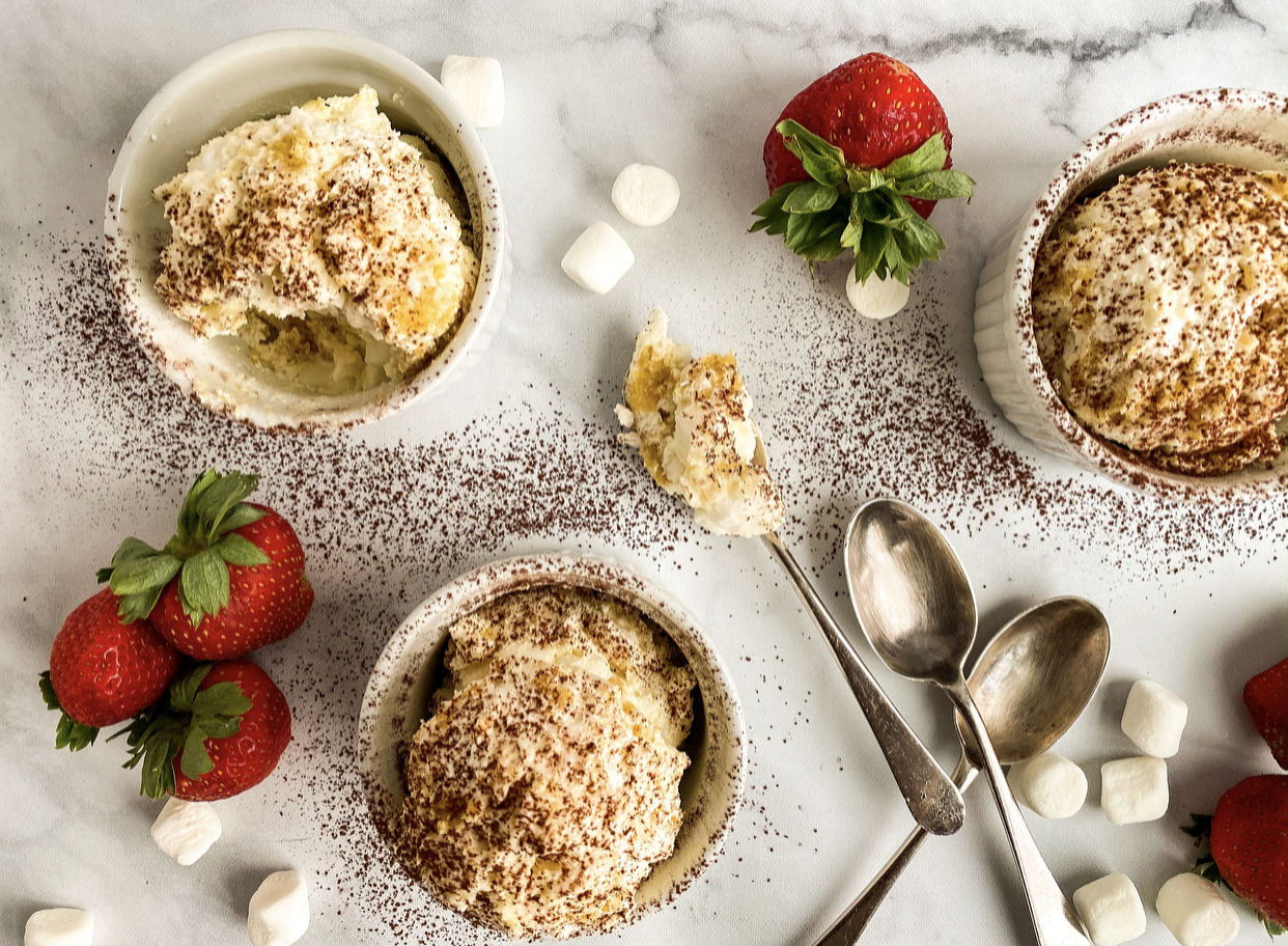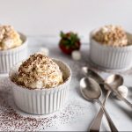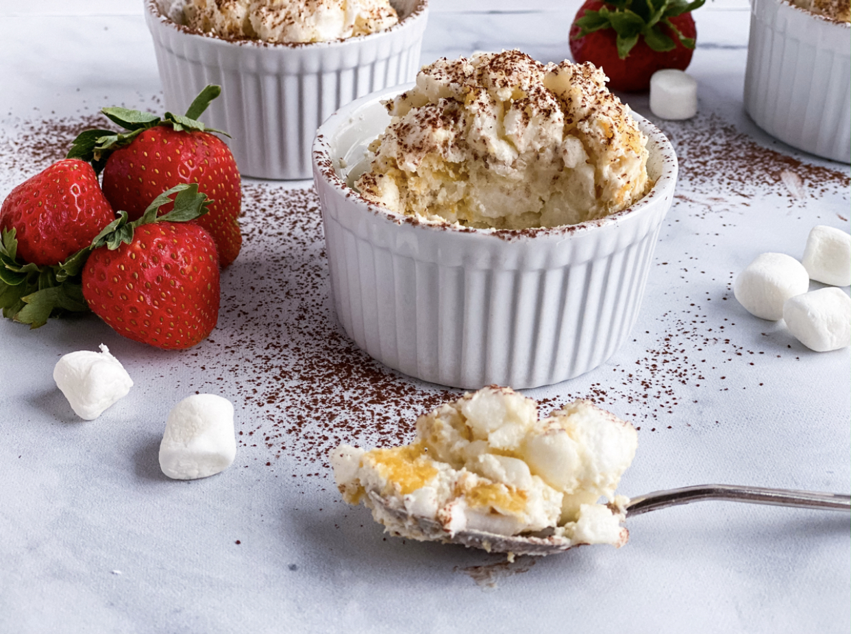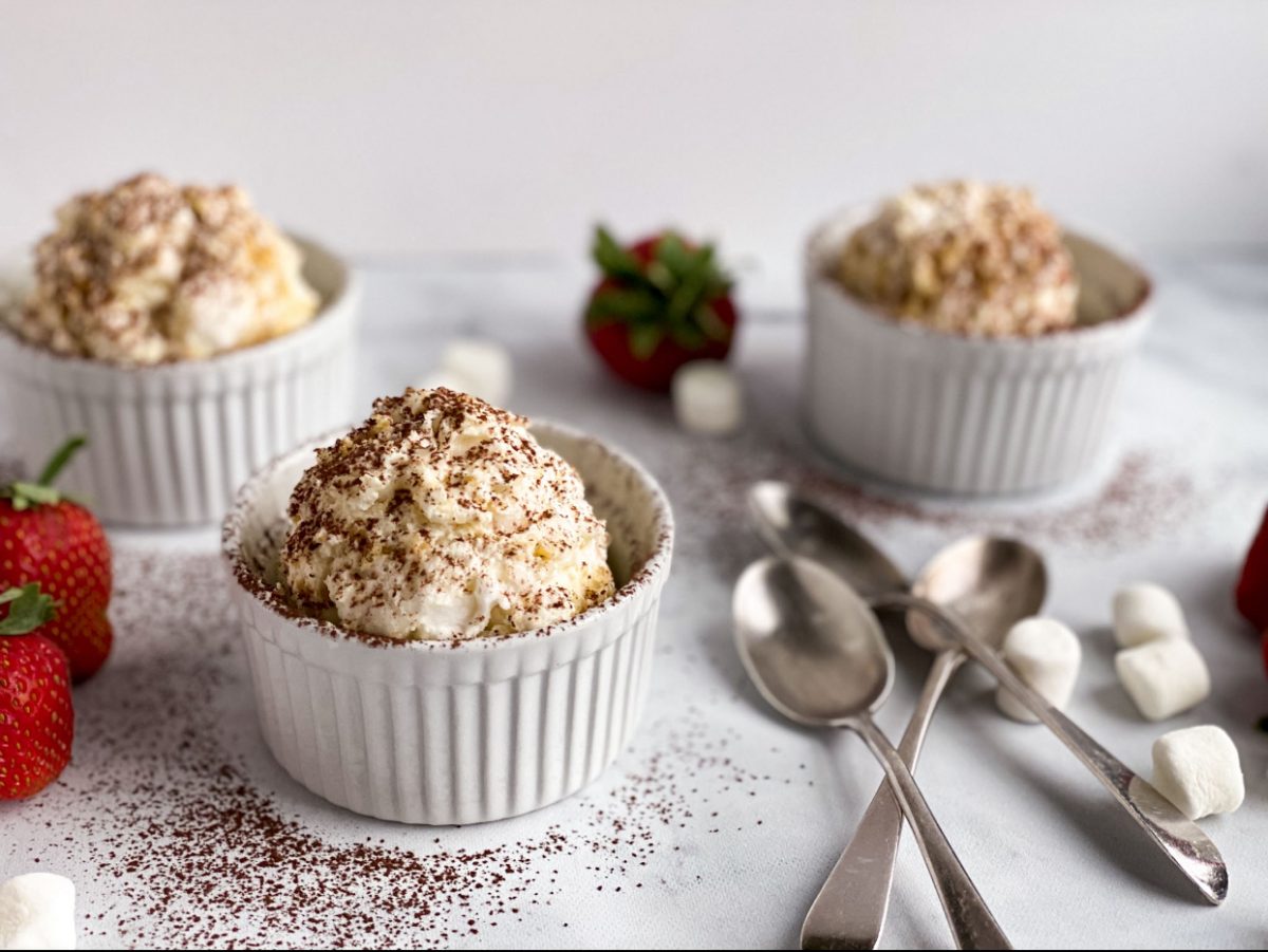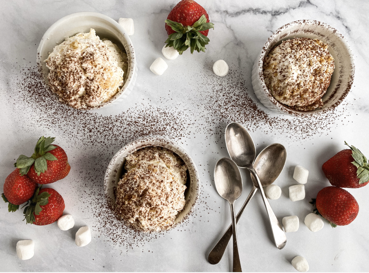 - Clean the stand mixer bowl and whisk attachment, and whisk the cream until stiff peaks form. Crumble the cookie and fold in to the whipped cream, along with the chopped up marshies. Cover the bowl with plastic wrap and place in the refrigerator for 2 hours. Serve with a dusting of cocoa powder and some slices of strawberries.