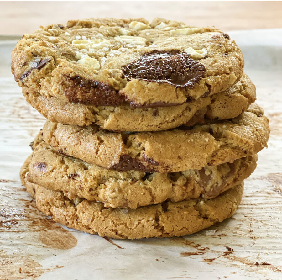 - When ready to bake off the cookies, preheat the oven to 350°F. Place 12 balls of dough (if making smaller cookies, less if making larger ones) on a parchment-lined sheet, sprinkle with flaky sea salt and bake for about 12 minutes (I’m also hugely in favor of slightly under baking cookies) rotating at the halfway point. Once removed from the oven, slightly flatten each cookie with a spatula (final thing I’m hugely in favor of: flat-ish thick and chewy cookies, as opposed to puffy ones), let cool briefly and enjoy.