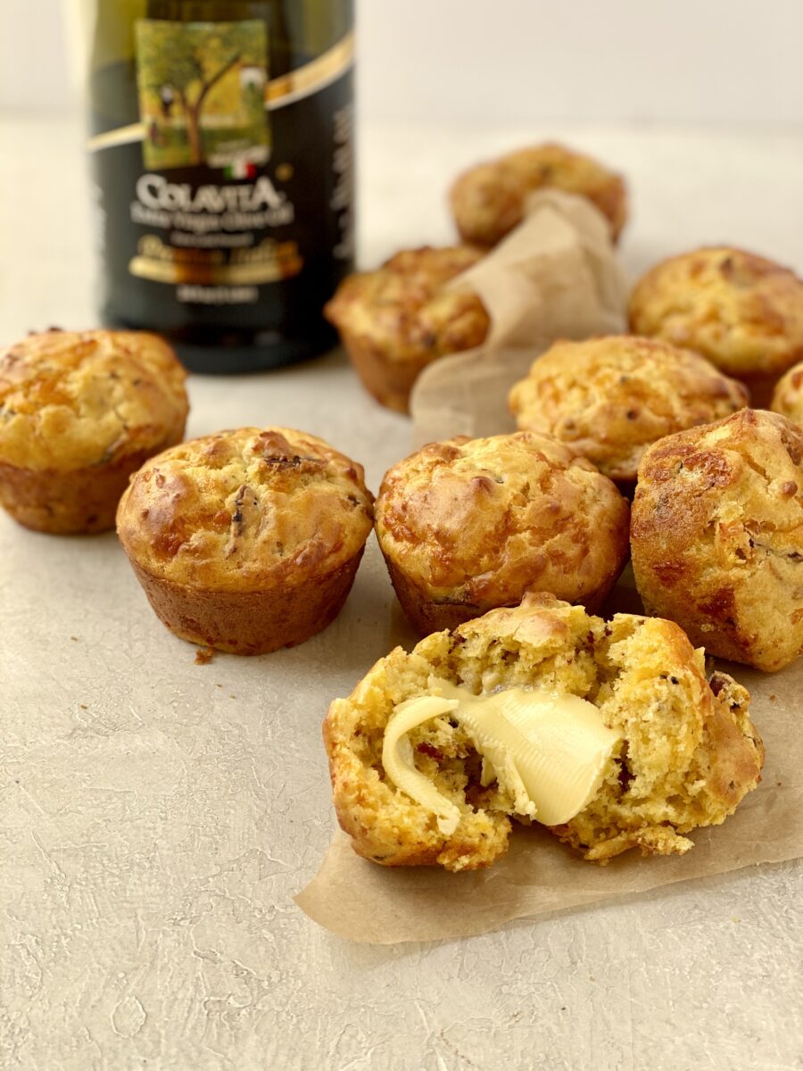 Cut to my partnership with my beloved Colavita Olive Oil in which I create an oil-based baked good each week to share with you all (you’re welcome — and you can watch me make this particular olive-oil based good on Instagram. The recipes call for – you guessed it — Colavita Olive Oil, and this week I decided to go in a savory direction with these bacon cheddar goodies. They are easy-peasy to assemble — like they literally take about 5 minutes — and call for copious amounts of sharp cheddar cheese and crispy bacon. The oil makes them wonderfully moist (and allows them to stay that way for days) and a little peppery.